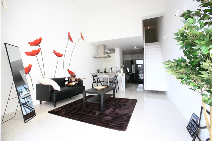 吹き抜けのあるリビングと階段は高い天井を活かした、開放感あるカットが撮影できます。